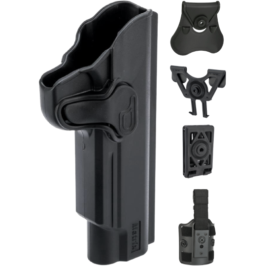 Esta funda se fabrica en colaboración con Matrix Tactical Systems y una planta de fabricación que produce fundas de acero real para armas de fuego. Matrix Group le ofrece una funda de carcasa rígida moldeada por inyección con seguro de gatillo diseñada específicamente para pistolas de airsoft utilizando el mismo proceso de fabricación que las fundas de acero real. Es compatible con KWA, KJW, Tokyo Marui, WE-Tech y la mayoría de las pistolas de airsoft similares, así como con armas de fuego reales.