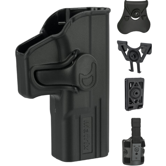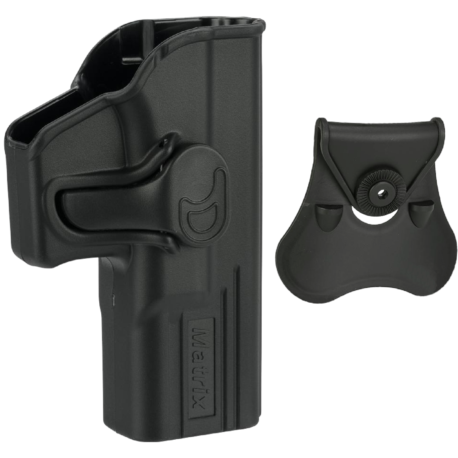Esta funda se fabrica en colaboración con Matrix Tactical Systems y una planta de fabricación que produce fundas de acero real para armas de fuego. Matrix Group le ofrece una funda de estilo Glock de carcasa rígida moldeada por inyección con seguro de gatillo diseñada específicamente para pistolas de airsoft utilizando el mismo proceso de fabricación que las fundas de acero real. Es totalmente compatible con las pistolas de las series KWA ATP, APS ACP, KJW, SAI y ISSC M22, así como con las armas de fuego Glock reales. Esta funda albergará todos los armazones Glock principales, como el 17, 18c, 19, 23, 32, 34, 35 y otros estilos similares.