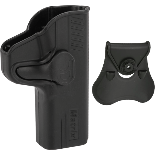 Esta funda se fabrica en colaboración con Matrix Tactical Systems y una planta de fabricación que produce fundas de acero real para armas de fuego. Matrix Group le ofrece una funda de carcasa rígida moldeada por inyección con seguro de gatillo diseñada específicamente para pistolas de airsoft utilizando el mismo proceso de fabricación que las fundas de acero real. Es compatible con Tokyo Marui, WE-Tech, VFC y la mayoría de las pistolas de airsoft similares, así como con armas de fuego reales.