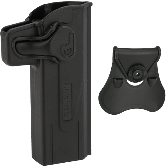 Esta funda se fabrica en colaboración con Matrix Tactical Systems y una planta de fabricación que produce fundas de acero real para armas de fuego. Matrix Group le ofrece una funda de carcasa rígida moldeada por inyección con seguro de gatillo diseñada específicamente para pistolas de airsoft utilizando el mismo proceso de fabricación que las fundas de acero real. Es compatible con Tokyo Marui, WE-Tech y la mayoría de las pistolas de airsoft similares, así como con armas de fuego reales.