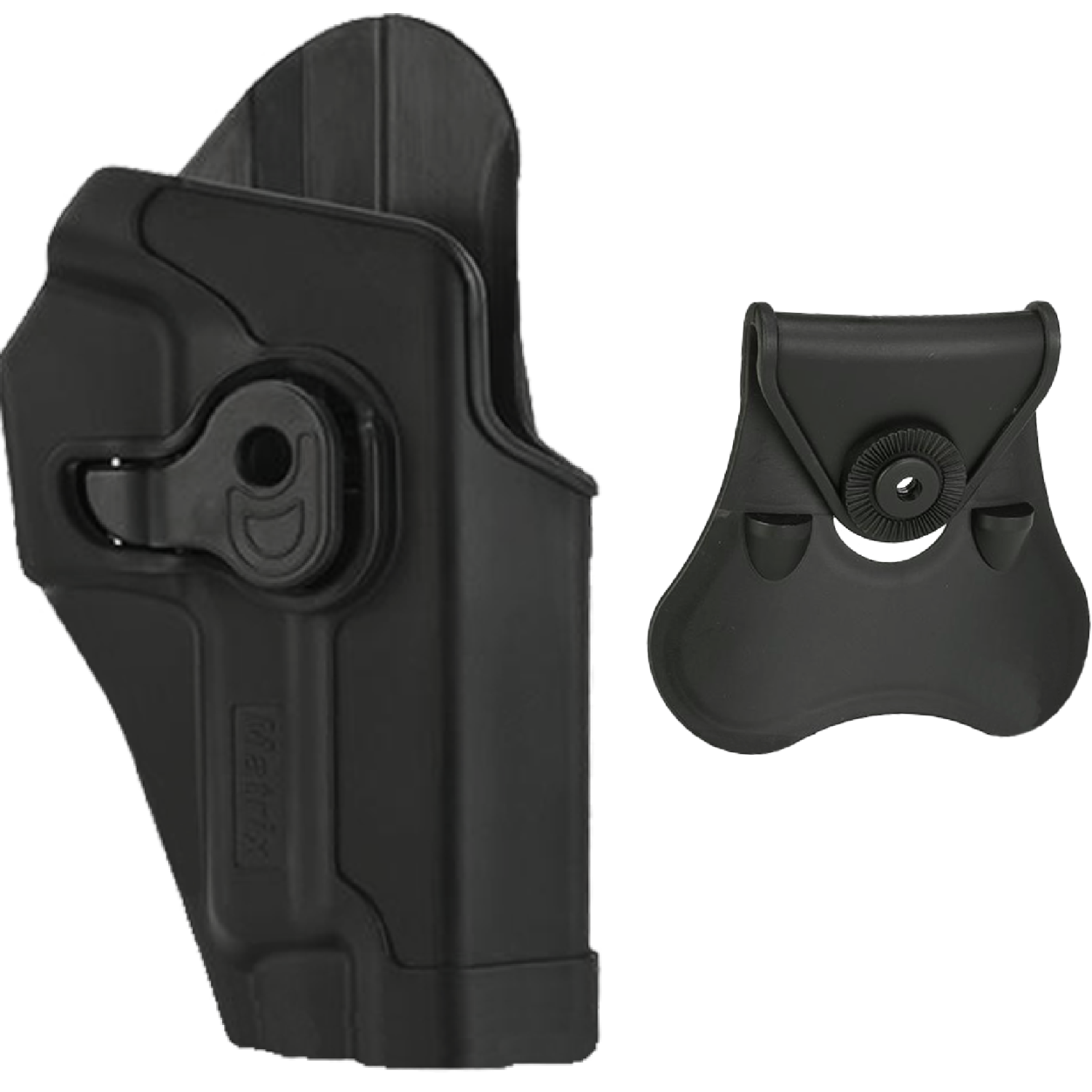 Esta funda se fabrica en colaboración con Matrix Tactical Systems y una planta de fabricación que produce fundas de acero real para armas de fuego. Matrix Group le ofrece una funda de carcasa rígida moldeada por inyección con seguro de gatillo diseñada específicamente para pistolas de airsoft utilizando el mismo proceso de fabricación que las fundas de acero real. Es compatible con Tokyo Marui, WE-Tech, KWA, KJW y la mayoría de las pistolas de airsoft similares, así como con armas de fuego reales.