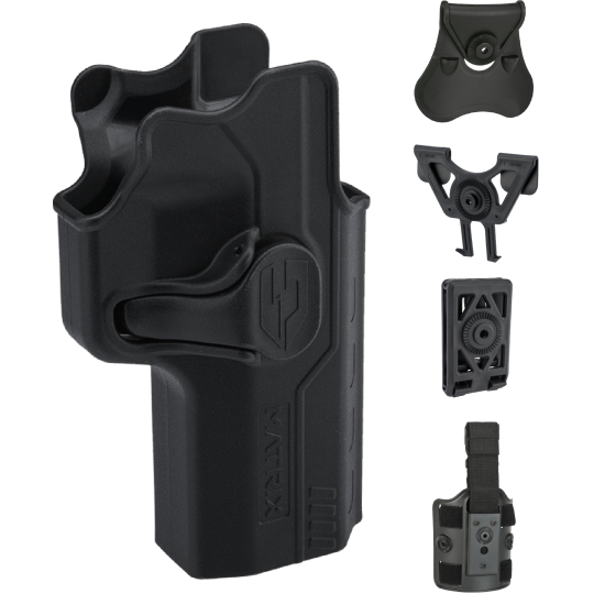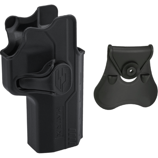 Esta funda se fabrica en colaboración con Matrix Tactical Systems y una planta de fabricación que produce fundas de acero real para armas de fuego. Matrix Group le ofrece una funda de estilo Glock de carcasa dura moldeada por inyección con seguro de gatillo diseñada específicamente para pistolas de airsoft que utilizan el mismo proceso de fabricación que las fundas de acero real. Es totalmente compatible con las armas de entrenamiento en paralelo de airsoft con retroceso de gas de la serie EMG Archon Firearms Type B. También puede ser compatible con otras marcas de pistolas de airsoft Archon Firearms Type B.