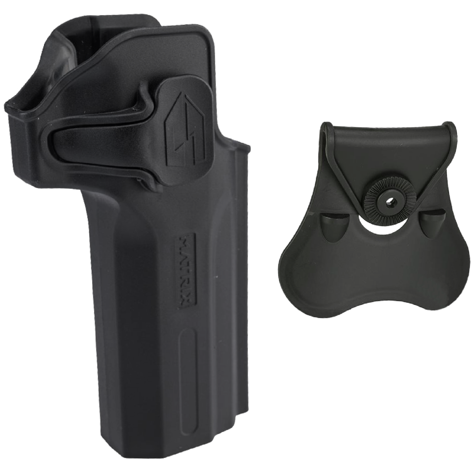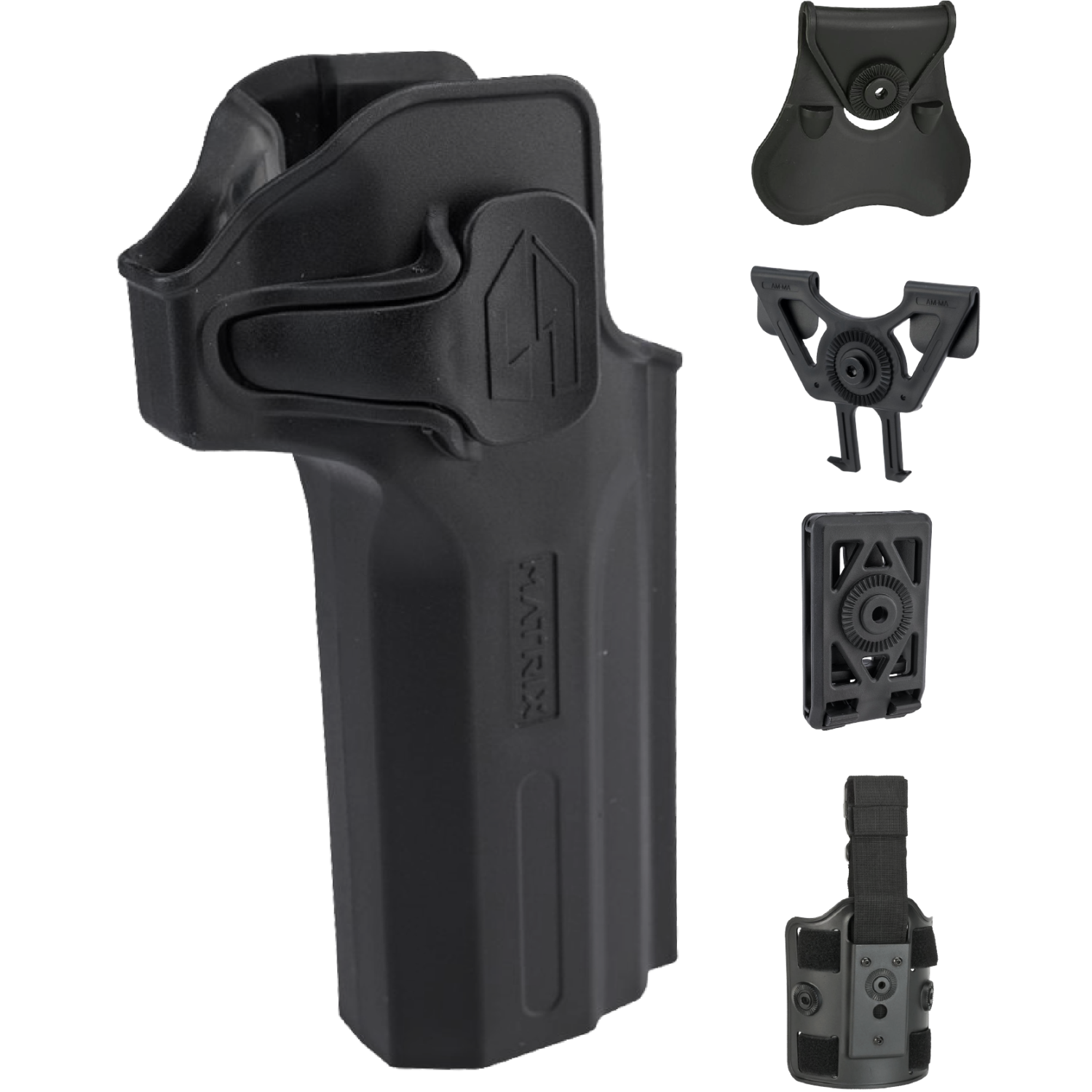 La serie Matrix Modular Holster es la respuesta a las necesidades de fundas de la mayoría de los aficionados al airsoft. Cualquiera que lleve un arma de mano sabe lo importante que es tener una funda y, si bien la mayoría de las fundas solo vienen configuradas para una configuración, con la serie Matrix Modular Holster puede configurar las necesidades de su arma como mejor le parezca, simplemente desatornillando la funda de su plataforma de montaje actual y volviéndola a colocar en la plataforma que elija, ya sea un soporte para cinturón, un soporte MOLLE o un panel de pierna abatible. Con la flexibilidad que ofrece el concepto modular de las fundas Matrix, solo necesitará una funda, que se puede configurar fácilmente según sus necesidades en el campo de batalla.