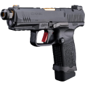 ¡El esperado proyecto de colaboración de Cybergun y Canik ya casi está aquí! La TP9 Elite Combat es una pistola compacta versátil con piezas de rendimiento diseñadas en colaboración con Salient Arms International, que incluyen un cañón de competición estriado y revestido de nitruro, protector de rosca, juego de miras y pozo de cargador. La pistola compacta tiene un armazón de polímero, se dispara con percutor y tiene una corredera preparada para ópticas que acepta las miras réflex más populares del mercado. Las palancas de tope de corredera en ambos lados permiten un uso ambidiestro. Este equivalente de Airsoft imita el diseño y se siente tan resistente como su contraparte de la vida real, con un cañón exterior SAI de estilo CNC, corredera preparada para ópticas y pozo de cargador y miras mecanizados por CNC.