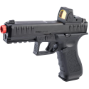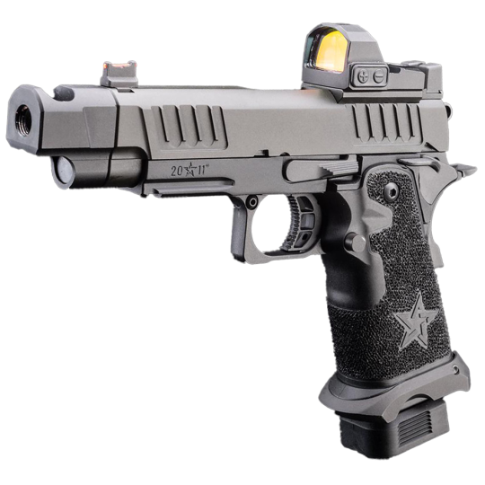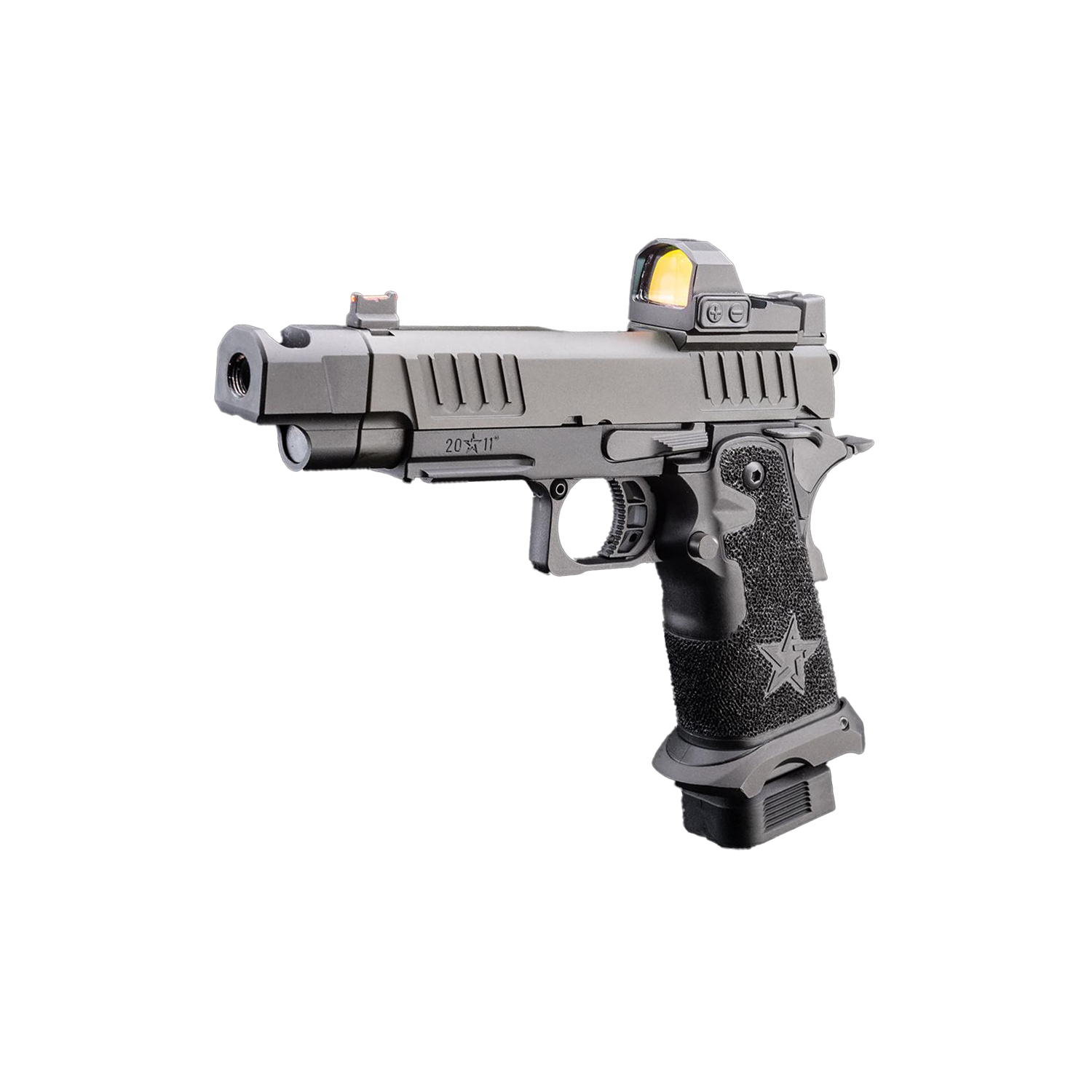 El auténtico Staccato P COMP SOC está aprobado para su uso por más de 1300 agencias de aplicación de la ley y lo llevan unidades de élite como los Texas Rangers y el Grupo de Operaciones Especiales de los Alguaciles de EE. UU., así como miles de oficiales en todo el país. El P COMP SOC cuenta con un compensador de una sola cámara para reducir el vuelco del cañón y el retroceso percibido. El P está finamente elaborado con cortes de aligeramiento anchos en la parte delantera y trasera de la corredera que proporcionan un agarre superior al inclinarlo hacia atrás, un retroceso reducido y una velocidad de ciclo mejorada. La corredera es compatible con RMR y viene con una placa RMR para la instalación de su mira de punto réflex favorita. Además, la corredera viene equipada con una mira delantera de fibra óptica y una mira trasera alta que permiten una funcionalidad continua cuando se instala una mira de punto réflex. El marco de metal P es robusto y tiene un peso agradable para una apariencia y sensación más realistas y viene con un riel para accesorios debajo del cañón para sus luces o láseres favoritos. Se preinstala una empuñadura de polímero punteada a mano que proporciona un agarre cómodo y seguro. Otras características incluyen un gatillo esqueletizado y un protector de gatillo texturizado que sigue brindando más estabilidad al disparar. La guinda del pastel son los auténticos logotipos, patrones y marcas de rodillos con licencia de Staccato.