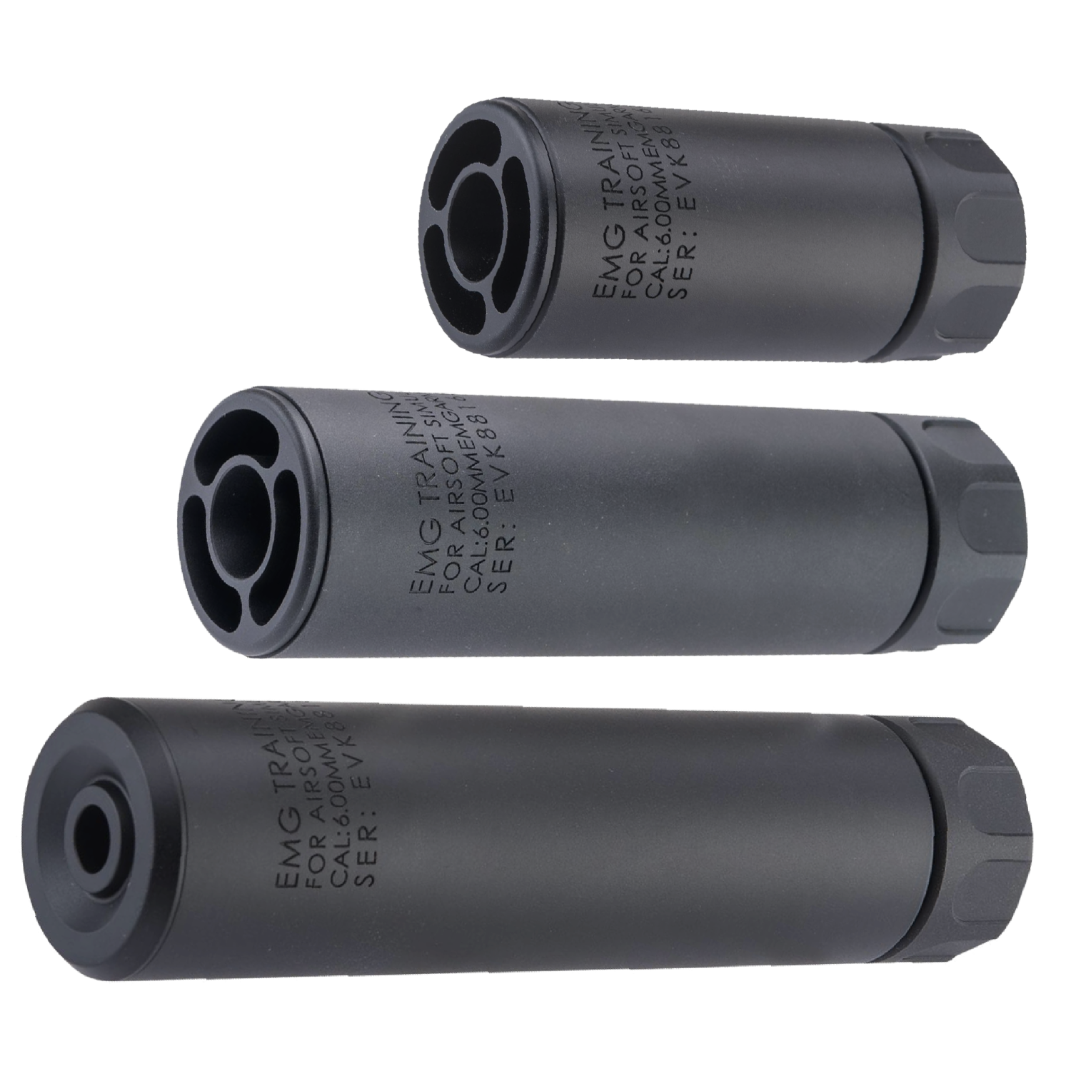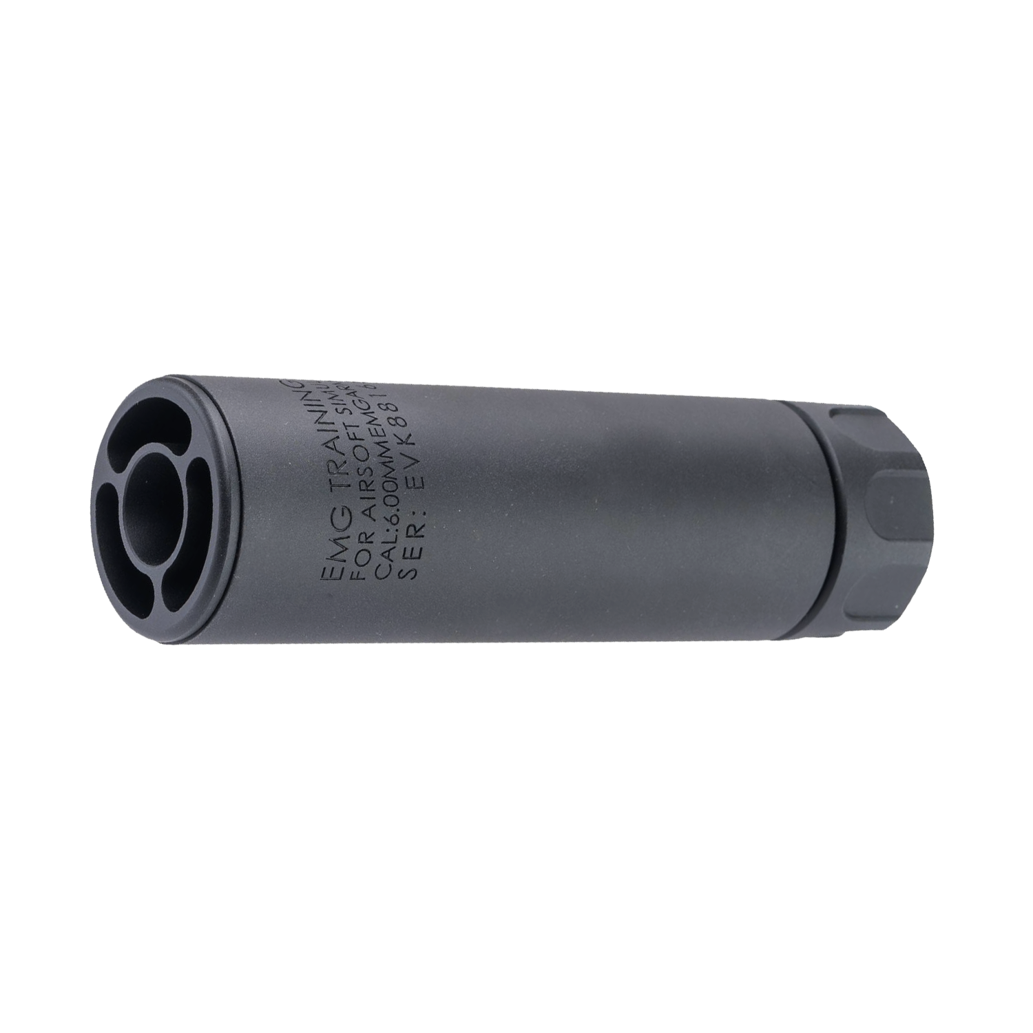 - Las marcas comerciales y el número de serie único de EMG Training Division están mecanizados en el cuerpo del supresor simulado.