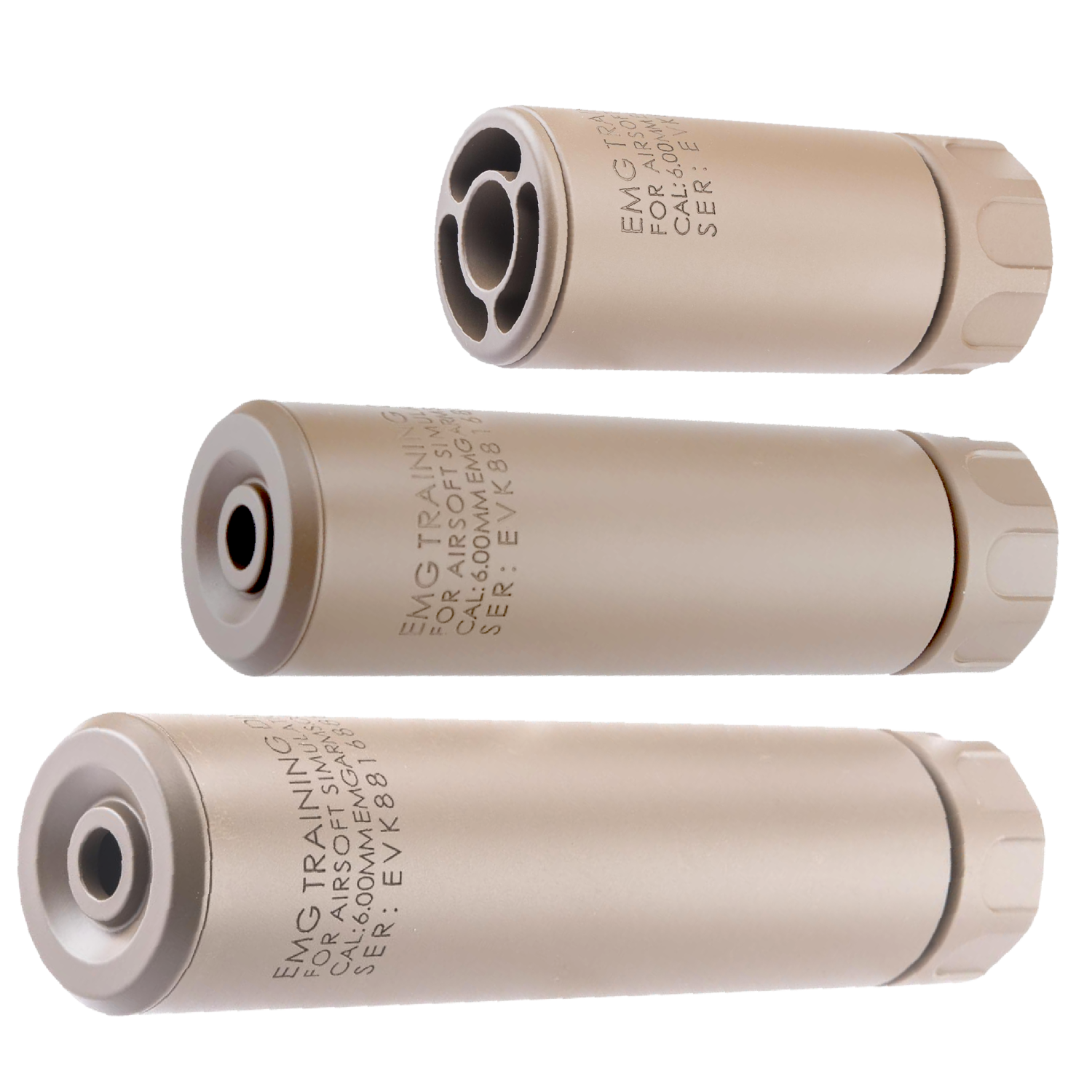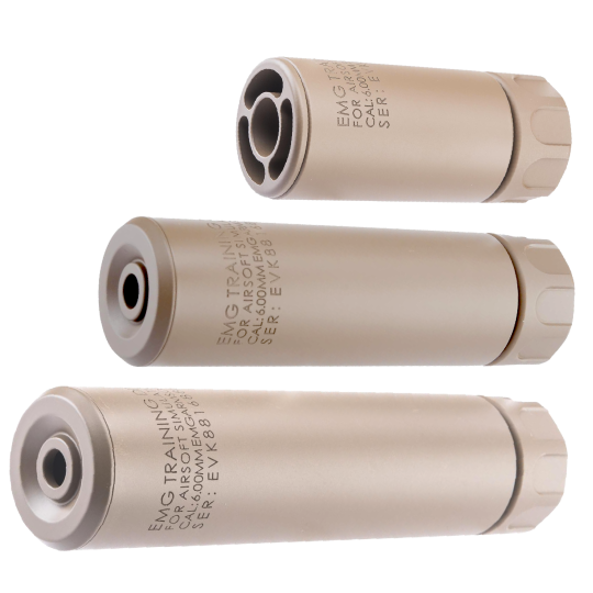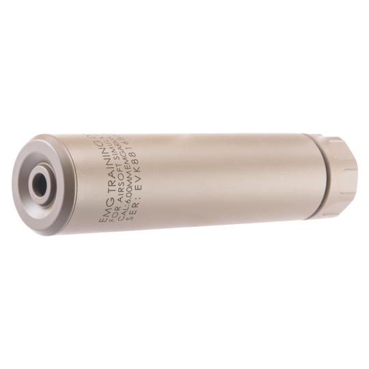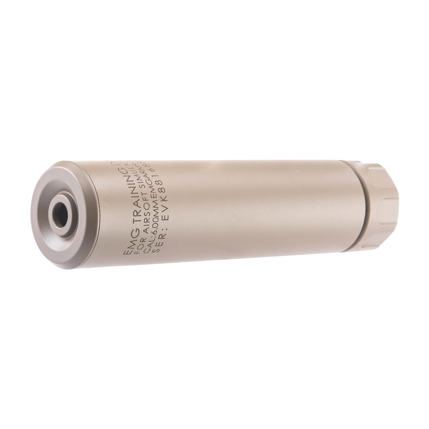 - Las marcas comerciales y el número de serie único de EMG Training Division están mecanizados en el cuerpo del supresor simulado.