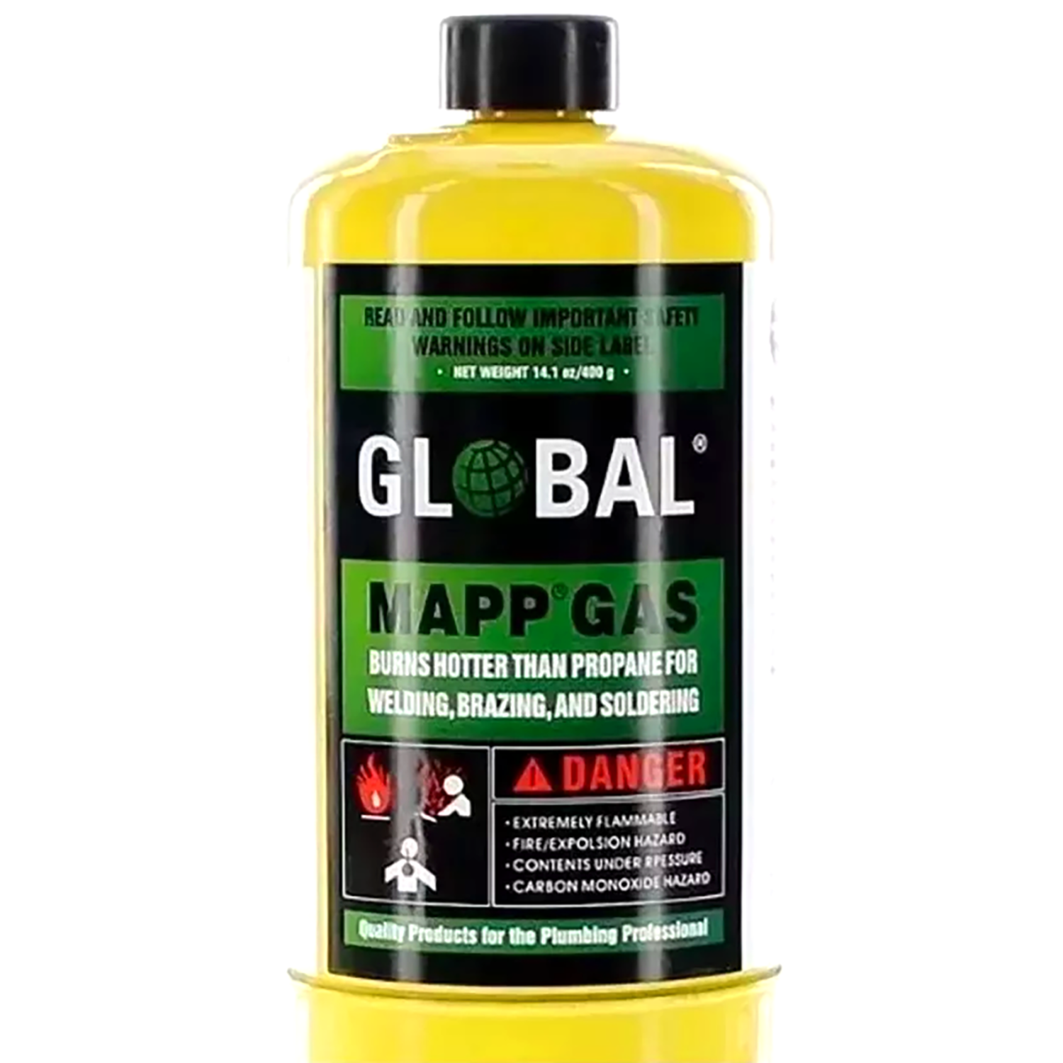 Gas MAPP GLOBAL 400 gr, es ampliamente utilizado en soldadura de alta temperatura , especialmente en la soldadura de tuberías de cobre en sistema de refrigeración, aire acondicionado, calefacción y plomeria, ademas, este gas también es utilizado en trabajos de corte y soldadura de metales en general, especialmente en aquellos trabajos que requieren alta precisión y una llama estable y constante, llega a temperatura de 1.900 grados Celsius.